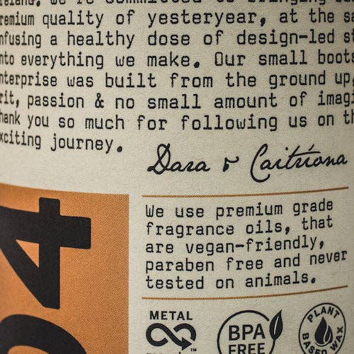 Notes: Sandalwood, patchouli, pepper, musk Family: Woody / Oriental. These are hand poured in Galway (west coast of Ireland) in small batches, combining rich complex fragrances with a base of 100% natural coconut & soy wax, using premium grade fragrance oils, that are vegan-friendly, paraben-free, and never tested on animals. Burn Time: 20hrs+.