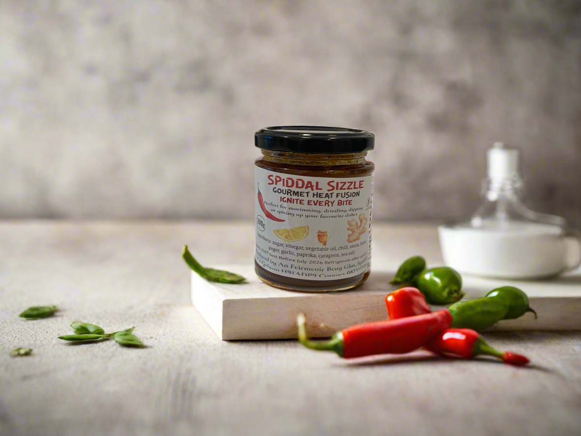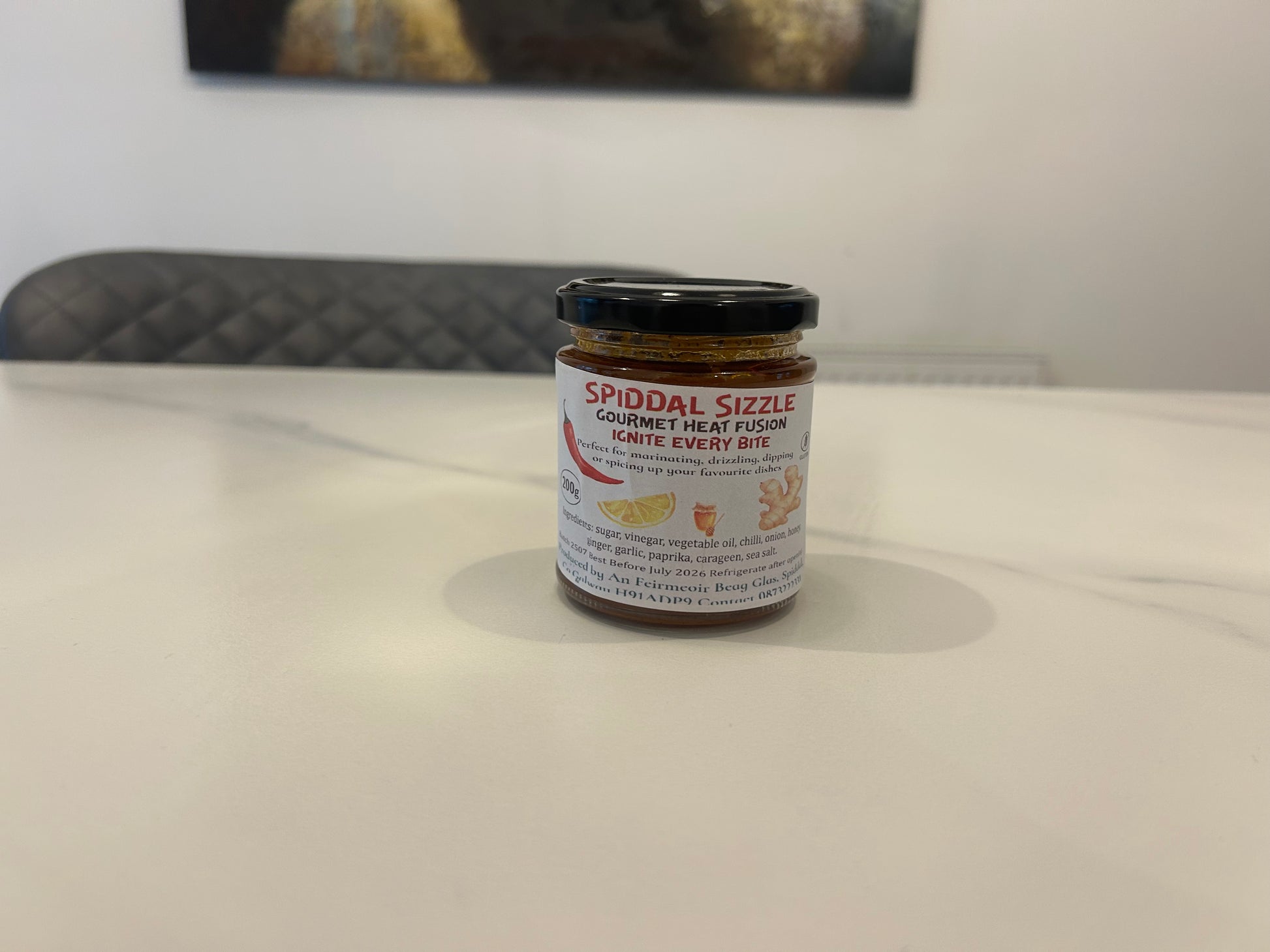 Enhance your dishes with the flavorful and versatile An Feirmeoir Glas Spiddal Sizzle emulsion sauce. Made with a special combination of roasted chillis, garlic, ginger, caramelised onions, and citrus fruit, it adds a unique touch to soups, casseroles, oriental dishes, and even spreads like hummus and mayonnaise. Try using it as a marinade for meats or tofu for a delicious and rich flavour.