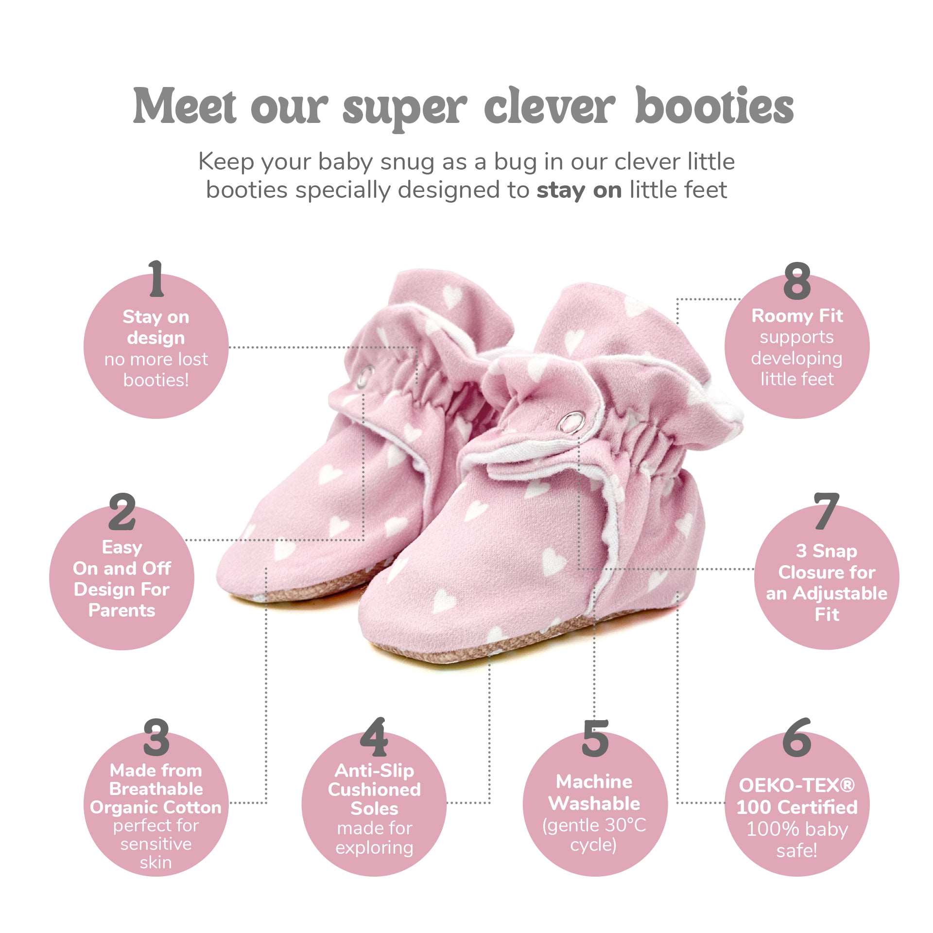 Keep your baby snug as a bug in our clever little booties specially designed to stay on little feet. No more lost booties!