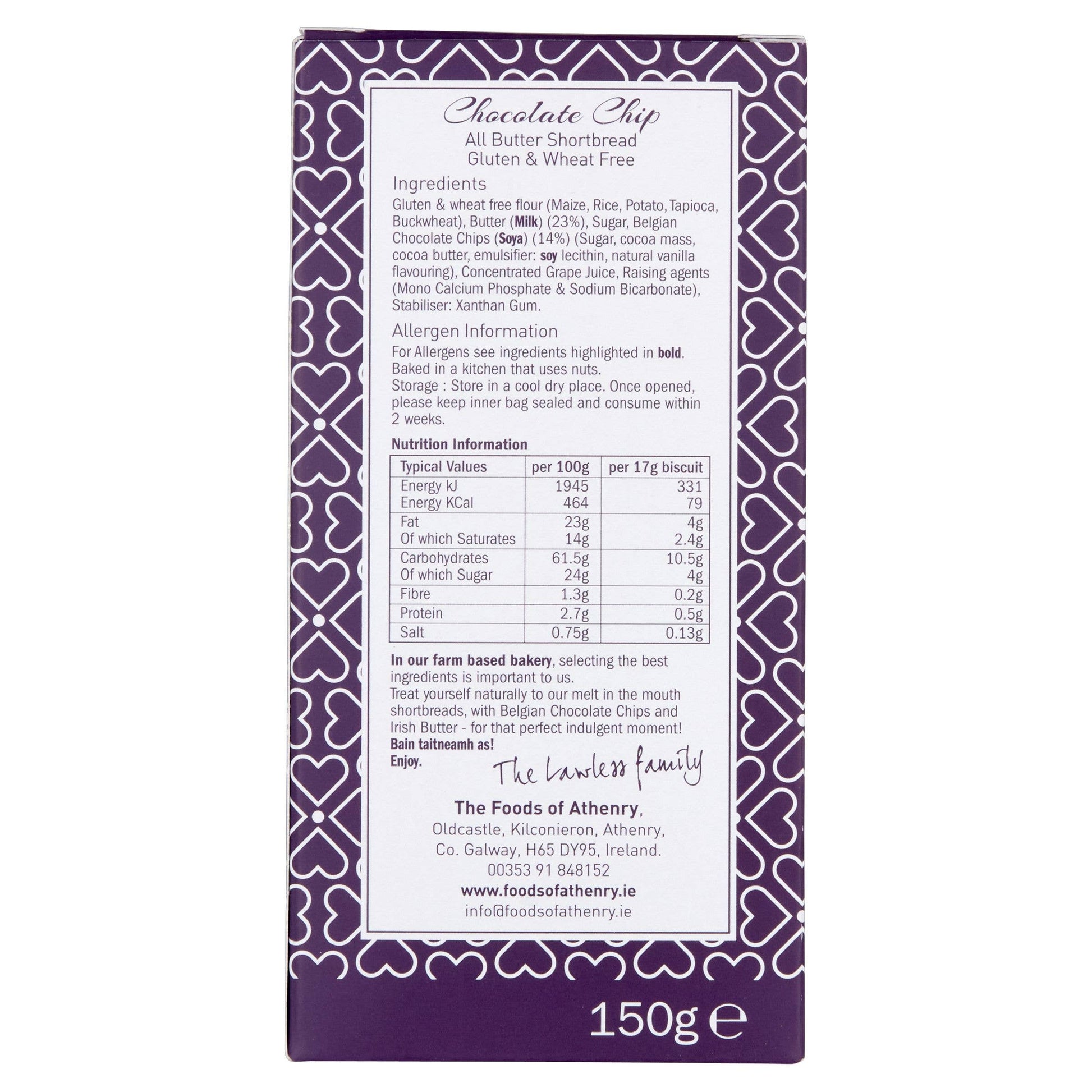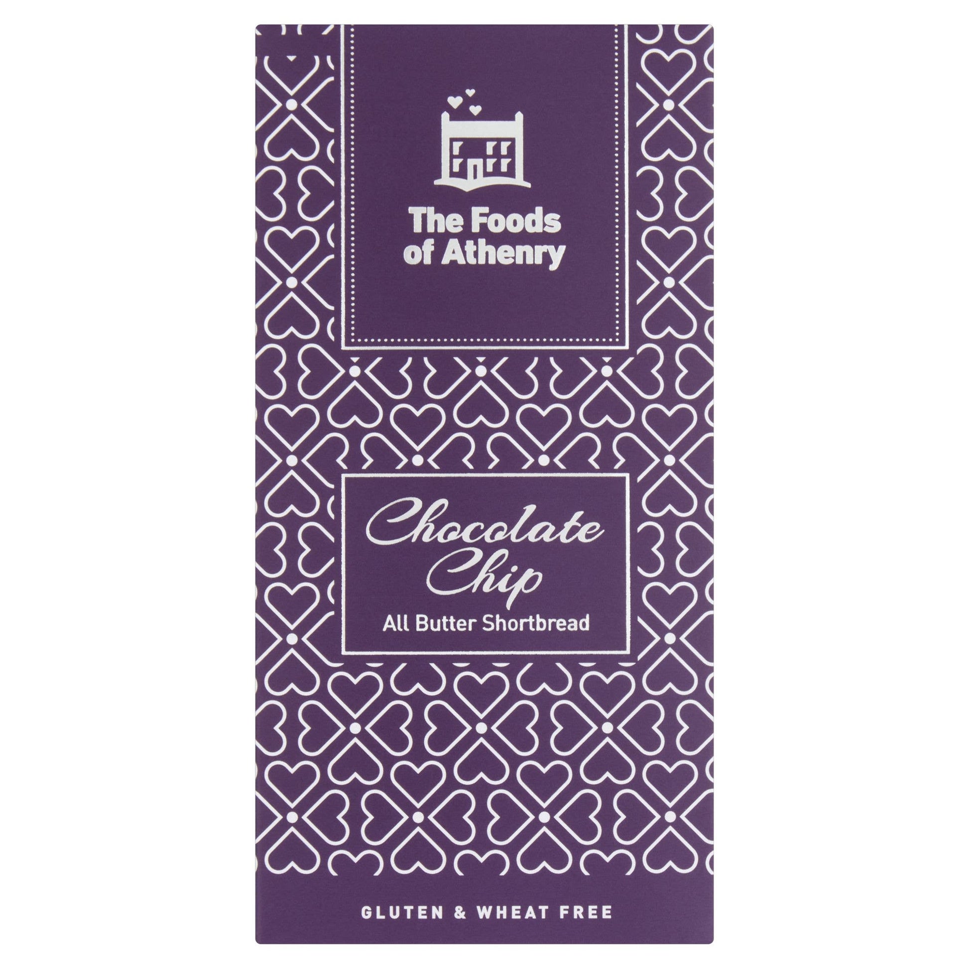 Decadent chocolate chip all butter shortbread made in Galway by the Foods of Athenry. Dietary details: Gluten free, wheat free, egg free.